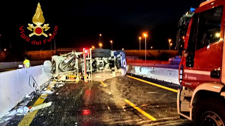 Intorno alle 21 una betoniera che trasportava 350 quintali di cemento, in transito sulla tangenziale Sud direzione Verona, per cause ancora in fase di accertamento ha perso il controllo ribaltandosi su un fianco dopo aver urtato i new jersey. Ferito il 61enne alla guida. Non risultano altri mezzi coinvolti.