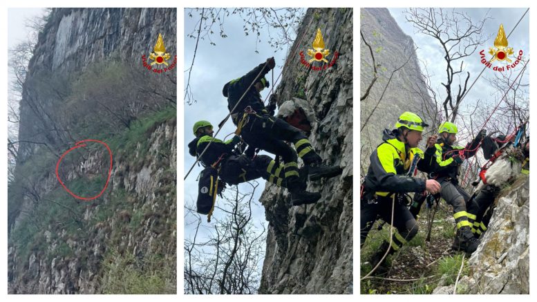 Capra bloccata sulla parete rocciosa, salvata dai vigili del fuoco nel bellunese.
