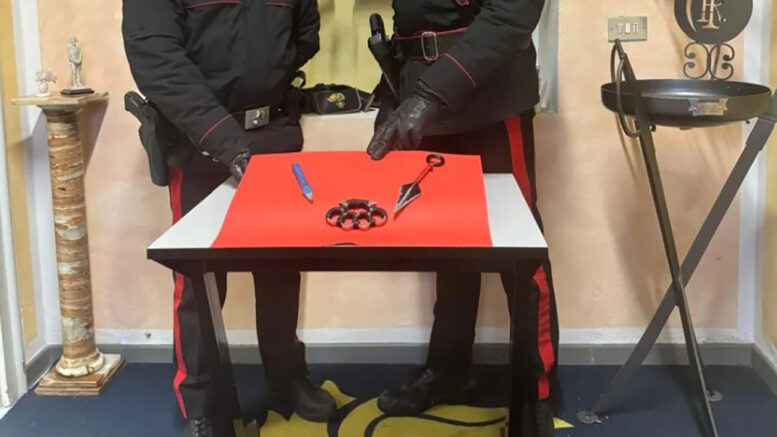 All’interno dello zaino i carabinieri hanno trovato una specie di arsenale: un tirapugni, un pugnale con una lama di 13 centimetri e uno scalpello lungo complessivamente 14 centimetri. Gli oggetti sono stati immediatamente sequestrati.