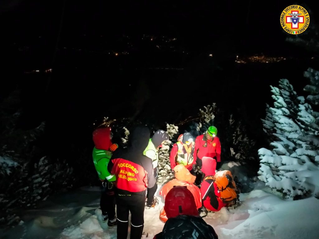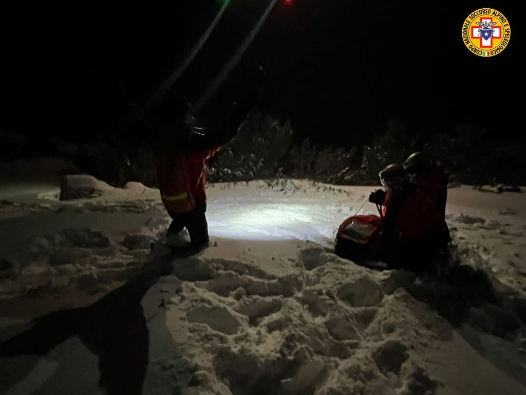 Verso le 23.30 la prima squadra è riuscita a raggiungerli. Subito la situazione è apparsa critica: uno dei due uomini era a terra, cosciente, ma immobile. Mentre una seconda squadra, con medico e infermiera si portava più vicino possibile in fuoristrada e quad, i soccorritori sul posto hanno subito provveduto a riscaldare con piumini e coperte termiche l’escursionista a terra e il compagno, che era in piedi, collaborativo e che, dotato di imbrago e assicurato, ha iniziato la discesa affiancato da due tecnici.