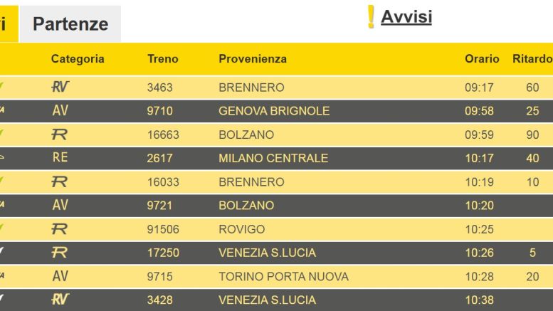 I treni Alta Velocità, Eurocity e Regionali possono quindi “registrare ritardi sulla linea Milano-Venezia”. Un ulteriore “inconveniente tecnico” è stato registrato anche nei pressi della stazione di Bologna.