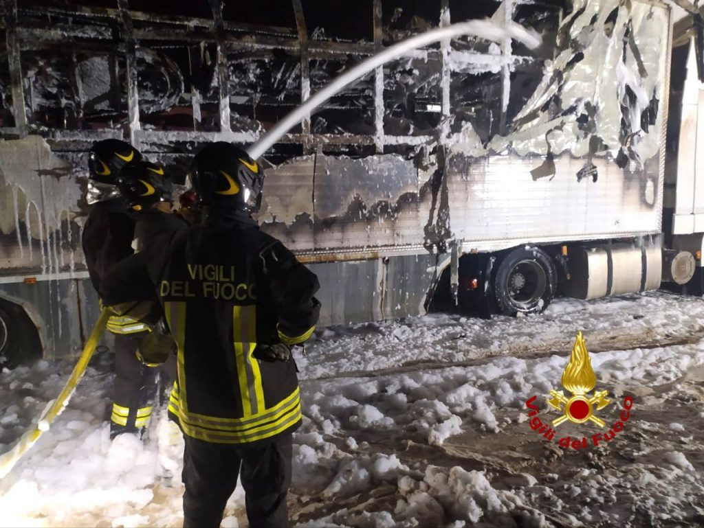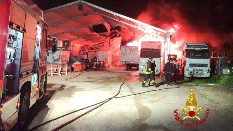 L’allarme è scattato intorno all’una di notte quando da una tensostruttura, aperta sui lati, di circa 450 mq si sono levate delle fiamme che hanno coinvolto dei mezzi pesanti utilizzati per il trasporto di attrazioni per luna park. Non risultano persone coinvolte.