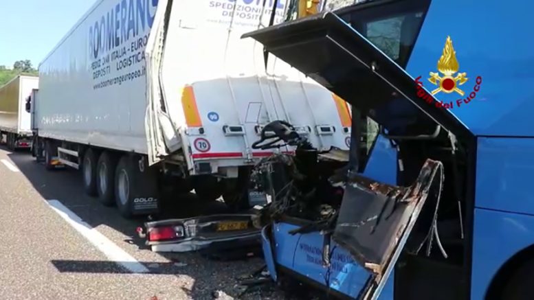 I pompieri intervenuti con due squadre, hanno messo in sicurezza i mezzi ed estratto non senza difficoltà utilizzando cesoie, divaricatori e martinetti idraulici l’autista del bus, proveniente dalla Serbia e diretto a Bolzano, rimasto incastrato al posto guida. Illesi i 19 passeggeri a bordo del bus proveniente dalla Serbia e diretto a Bolzano, come anche i due autisti dei mezzi pesanti. L’autista è stato preso in cura dal personale sanitario del Suem stabilizzato e trasferito in ospedale. Sul posto la polstrada e il personale ausiliario dell’autostrada. Lunghe le code formatasi in direzione Milano per il sinistro e in direzione Venezia per curiosi. Le operazioni di soccorso dei vigili del fuoco sono terminate dopo circa un’ora. Sono ora in corso le operazioni di rimozione del pullman da parte del soccorso stradale.
