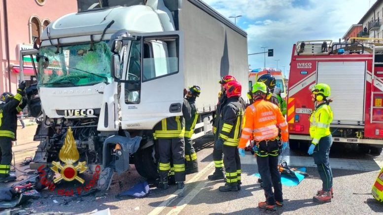 Incidente con tamponamento tra due camion a Colognola ai Colli: uno dei due autisti rimane incastrato nell’abitacolo del mezzo.