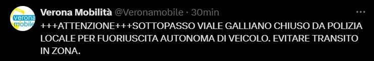 Questa volta, secondo quanto ricostruito, si tratterebbe della fuoriuscita autonoma di un’auto, che ha però costretto la polizia locale di Verona a chiudere il sottopasso. La stessa polizia invita quindi a non transitare in zona.