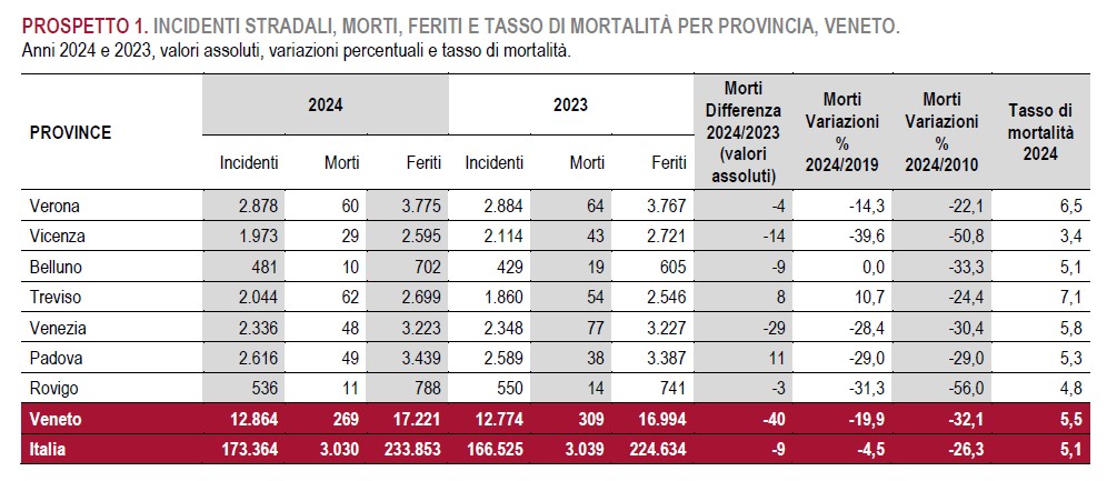 Nel 2024 in provincia di Verona si sono registrati 2.878 incidenti, in linea con l’anno precedente: i morti sono stati 60, 3.775 i feriti.