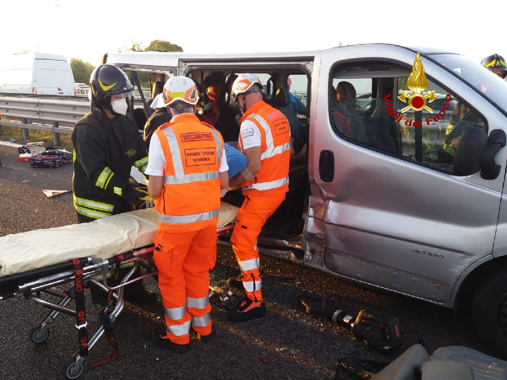 Partiti dal distaccamento di Caldiero, con 2 mezzi e 5 uomini, i vigili del fuoco hanno operato per liberare 6 persone rimaste incarcerate in alcuni mezzi interessati in un tamponamento. In totale sono 3 autovetture e 3 pulmini, tutti che viaggiavano in direzione Milano, coinvolte nello scontro.