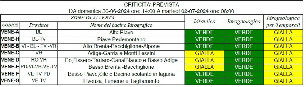 La criticità è riferita al permanere di livelli sostenuti lungo l’asta del fiume Adige e nelle zone VENE-D (RO-VR) e VENE-E (PD-VI-VR-VE-TV) è da considerarsi “gialla” solamente nel tratto a valle di Boara Pisani, mentre è da considerarsi verde nel tratto a monte. L’avviso vale dalle ore 14 di oggi alle 6 di martedì 2 luglio 2024.