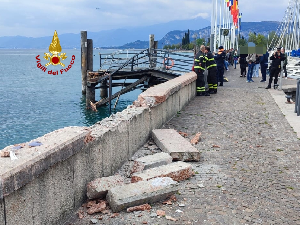 Incredibile incidente nautico nel porto di Bardolino oggi, giorno di Pasqua, intorno alle ore 14.30. La motonave Baldo, per cause ancora sconosciute, in fase di ormeggio ha impattato violentemente contro la banchina della Navigarda distruggendo parte del pontile e del muro di confine. Nell’urto tre persone, due adulti e un minore, sono rimasti lievemente feriti e hanno dovuto ricorrere alle cure dei sanitari giunti sul posto.