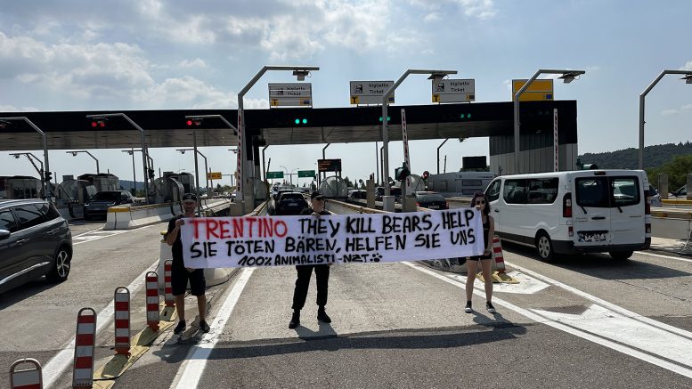 Militanti animalisti bloccano il casello di Affi per protestare contro le uccisioni di orsi in Trentino.