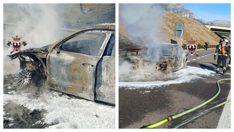 Auto in fiamme sull’autostrada A22, tra Avio e Affi: l’incendio ha distrutto una Porsche condotta da un uomo di 81 anni.