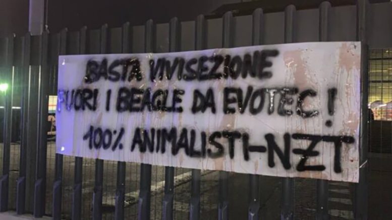 Ed ecco la “rivendicazione”: “La lotta del Movimento Centopercentoanimalisti non si ferma, in prima serata del 6 settembre, i nostri militanti sono tornati in via Fleming a Verona davanti ai cancelli di Evotec. Questa volta oltre al manifesto, è stato gettato del sangue (artificiale) sullo striscione affisso e sul cancello d’entrata dell’azienda. Non intendiamo far spegnere i riflettori sulla questione”.