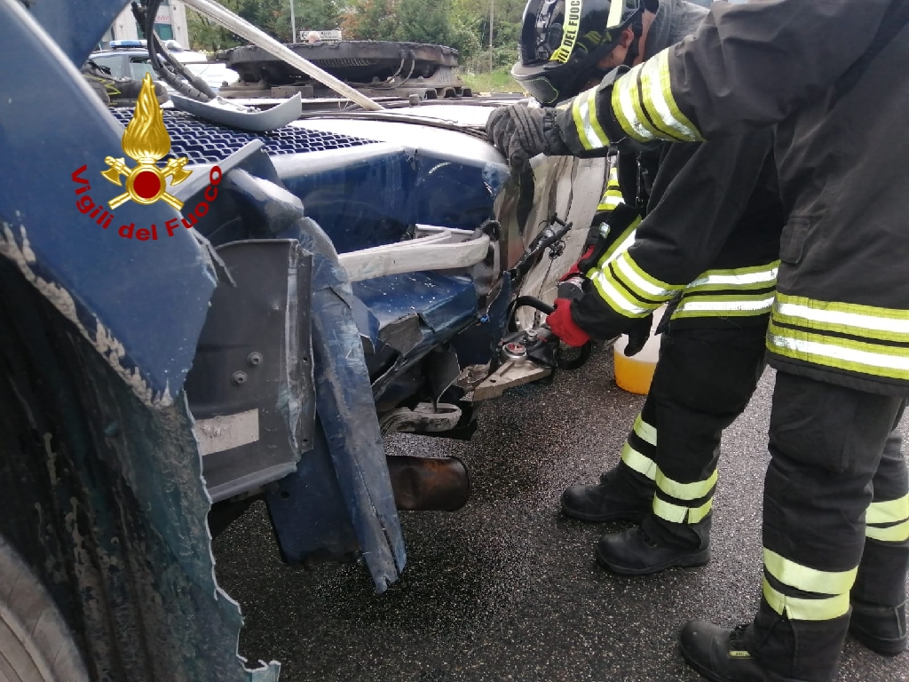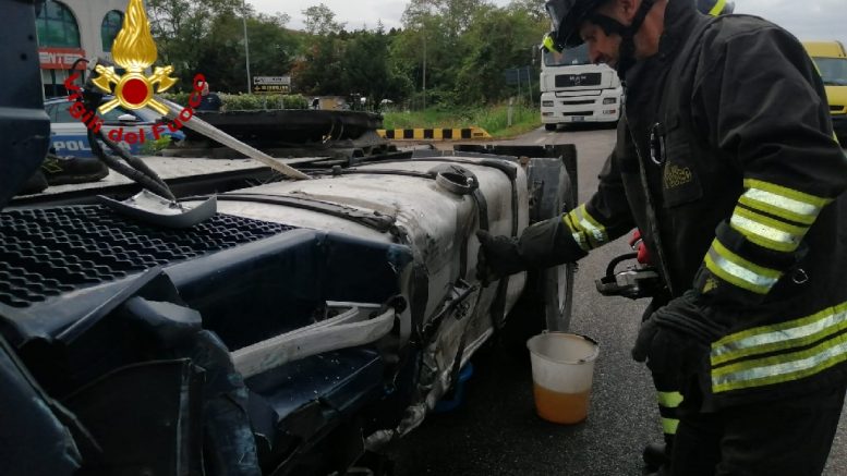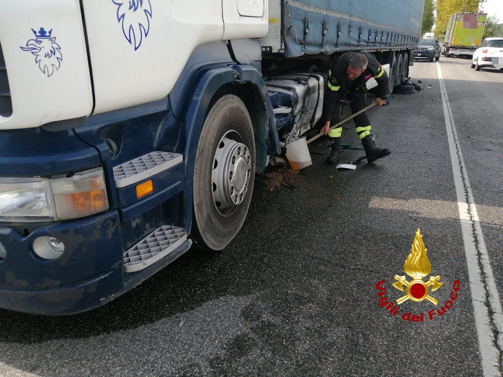 Scontro tra auto e camion, il serbatoio va in pezzi e il carburante finisce in strada. Alle ore 12.15 di oggi, 28 settembre, i vigili del fuoco sono intervenuti per un incidente stradale sulla statale 11, via Bresciana, nel comune di Verona. L’incidente ha visto coinvolti un’autovettura che, dopo aver perso il controllo ha invaso la corsia opposta e si è scontrata con un mezzo pesante, illesi i due conducenti.