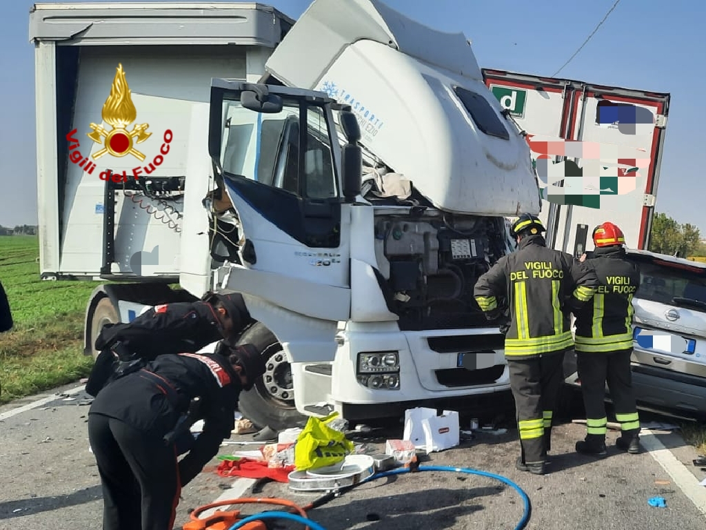 Scontro tra due tir nella tarda mattinata di oggi, mercoledì 11 ottobre, lungo la provinciale 21. Coinvolta anche un’auto che transitava in quel momento. L’incidente, secondo le prime informazioni, è avvenuto poco prima di mezzogiorno all’altezza di Villafontana.