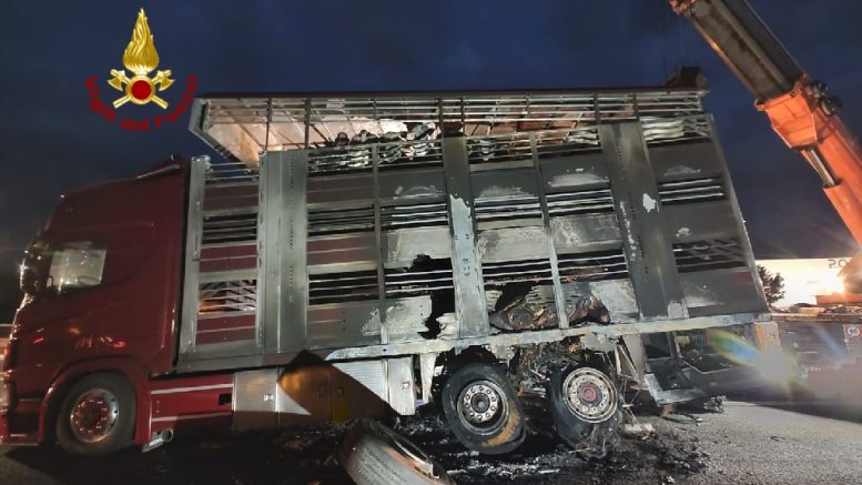 Allertati, i vigili del fuoco di Verona sono giunti sul posto con 3 mezzi e 9 uomini, per spegnere le fiamme che lambivano la motrice al cui interno erano trasportate 23 vacche divise su 2 piani. Per le bestie stivate al piano inferiore, 13 animali, non c’è stato nulla da fare, sono deceduti a causa delle fiamme.