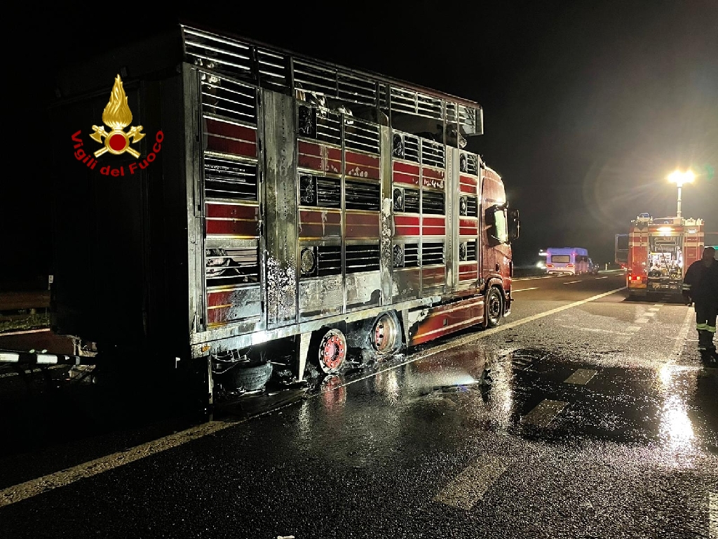 Nessun danno invece agli animali presenti al piano superiore della motrice a alle 13 vacche trasportate sul rimorchio. Le operazioni di minuto spegnimento e bonifica sono terminate intorno alle 7 con la rimozione del mezzo e la riapertura della viabilità autostradale rimasta chiusa fino ad allora.