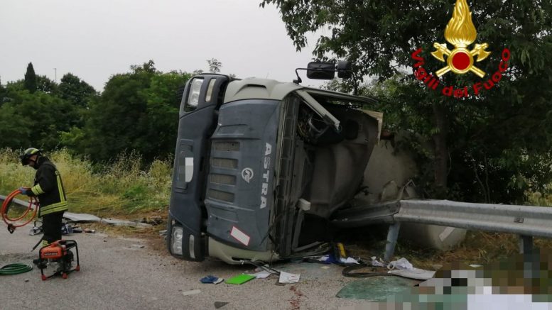 E’ un giovane autista di 30 anni la vittima del drammatico incidente di Bussolengo. Alle ore 14.40 di oggi, venerdì 21 giugno, i vigili del fuoco sono intervenuti in tangenziale nord per il ribaltamento di un mezzo pesante. Una betoniera, carica di cemento e in transito sulla SS 12, tangenziale nord, in direzione San Pietro in Cariano, nell’affrontare lo svincolo di Bussolengo, si è ribaltata su un fianco finendo sul guard rail.