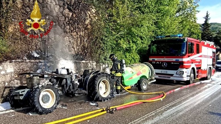 Trattore a fuoco sulla provinciale 34 a Marano di Valpolicella.