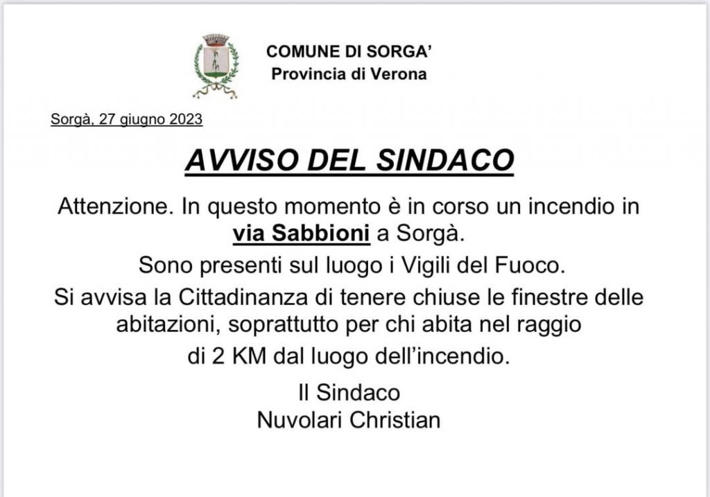 Il sindaco di Sorgà Cristian Nuvolari, sentiti i vigili del fuoco, ha emesso, a titolo prudenziale, un’ordinanza con la raccomandazione di tenere infissi e porte chiusi fino a completo spegnimento del fuoco, per tutte le abitazioni situate in un raggio di 2km dall’incendio.
