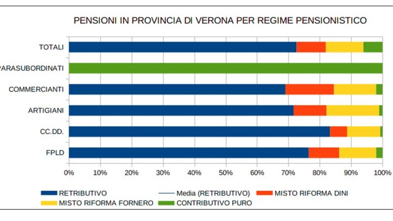 Nella provincia di Verona sono già 12.825 (circa il 6% del totale delle pensioni da lavoro) le pensioni pagate con il sistema del contributivo “puro”, cioè calcolate sulla base dei soli contributi versati. La grande maggioranza di esse (9.512 pensioni, con importi medi di appena 228,68 euro) appartengono al fondo dei lavoratori parasubordinati, una categoria spuria (né dipendenti né autonomi) “istituita” nel 1995 con l’introduzione della “Gestione Separata” dell’Inps nel tentativo di tenere insieme un mercato del lavoro in continuo smottamento.