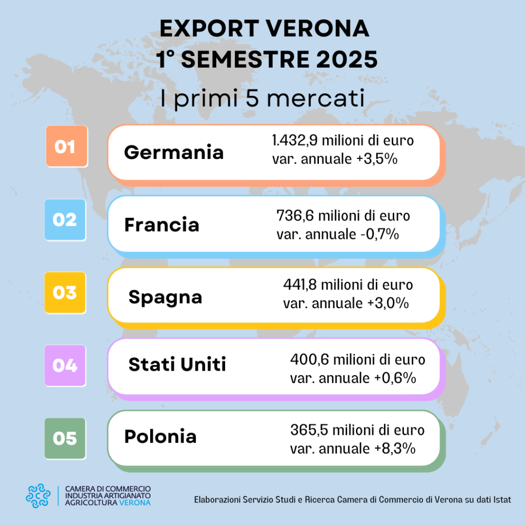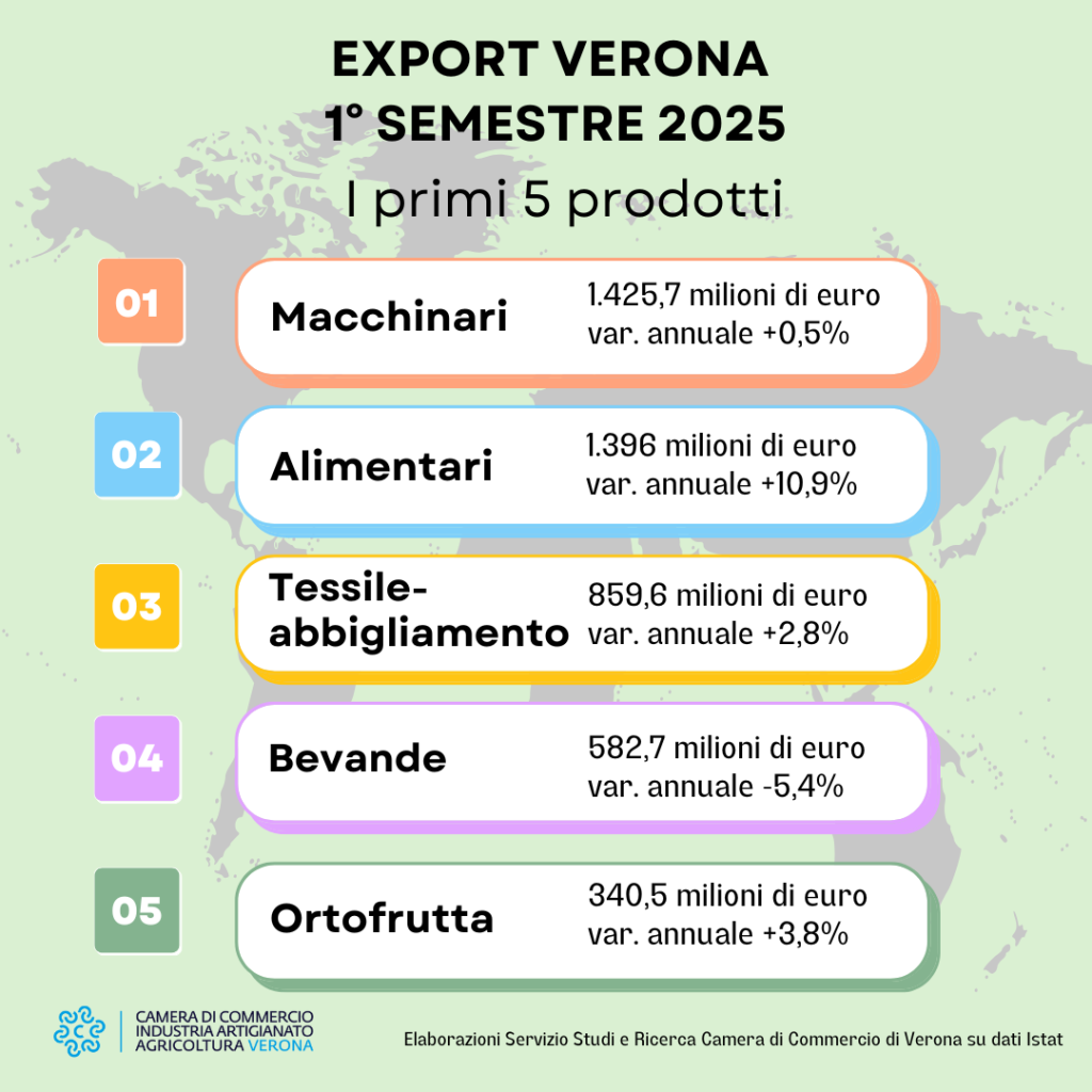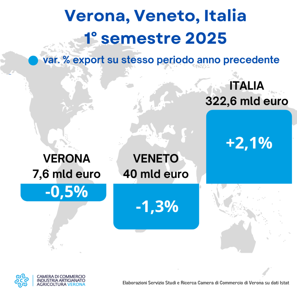 L’export veronese tiene botta nonostante le difficoltà internazionali: primo semestre 7,6 miliardi di euro, meglio della media regionale. Nei primi sei mesi del 2025 il valore delle esportazioni ha avuto un calo leggerissimo dello 0,5% rispetto allo stesso periodo del 2024. Un dato che, pur segnando il segno meno, si rivela migliore della media regionale (-1,3%) e di tutte le altre province venete. A livello nazionale, invece, le vendite all’estero sono cresciute del 2,1%.