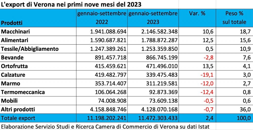 L’export veronese nei primi nove mesi dell’anno raggiunge 11,5 miliardi di euro, ma rallenta la sua corsa ad una crescita del 2,4%, per quanto la performance sia migliore di quella veneta (0,7%) e italiana (1%).