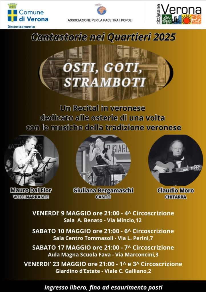 Torna a Verona la rassegna Cantastorie nei Quartieri: tutto pronto per “Osti, Goti, Stramboti”, il recital in veronese sulle osterie di una volta. L’evento è promosso dal Comune di Verona nell’ambito del progetto Città Sane in collaborazione con l’Associazione per la Pace tra i Popoli. L’edizione di quest’anno propone il recital “Osti, Goti, Stramboti”, uno spettacolo in veronese dedicato alla memoria delle vecchie osterie e alle musiche della tradizione locale.