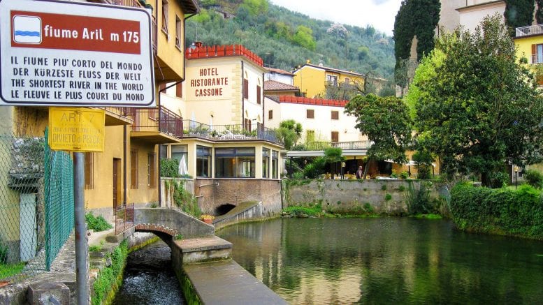 Ribaltando la classifica torreggiata dal Nilo e dal Rio delle Amazzoni, che con i loro 6852 e 6450 chilometri bagnano rispettivamente undici e sei paesi, troveremo il fiume Aril, che sgorga da una risorgiva nella frazione di Cassone, nel comune di Malcesine, per immettersi nel lago di Garda 175 metri più avanti.