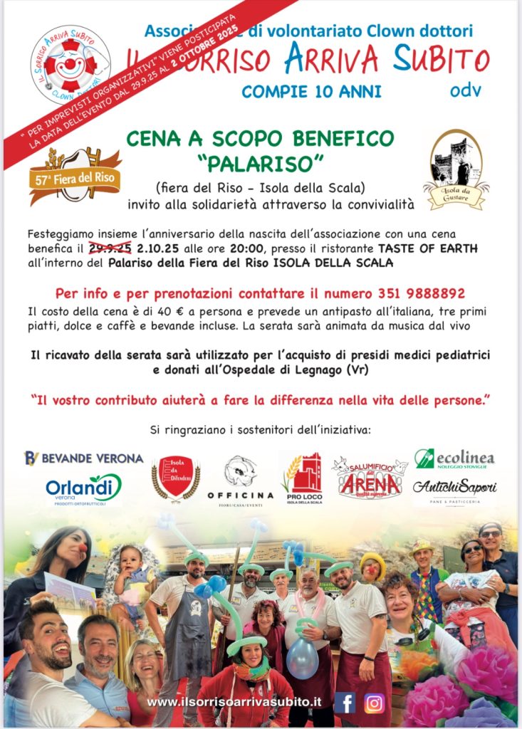 L’associazione “Il Sorriso Arriva Subito” spegne le sue prime 10 candeline: giovedì 2 ottobre alle 20, cena benefica al Palariso pro ospedale di Legnago. L’evento sarà al ristorante Taste of Earth all’interno della Fiera del Riso a Isola della Scala.
