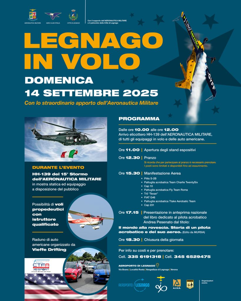 Autorizzato dall’Aero Club d’Italia e organizzato dall’Associazione Volo Legnago insieme ad A.I.V.A. – Associazione Italiana Volo Acrobatico, l’evento gode del supporto straordinario dell’Aeronautica Militare e del patrocinio della Città di Legnago. In collaborazione con l’Aeroclub di Lucca e con il contributo di Vieffe Drifting per il raduno di auto americane, la giornata offrirà un programma fitto di spettacoli, incontri e attività.