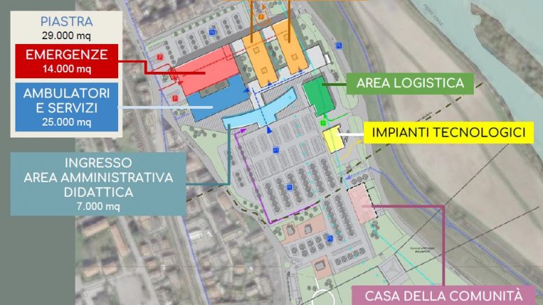 A rappresentare dal punto di vista architettonico il passaggio tra il vecchio ospedale e il nuovo sarà la parte ad arco, che verrà reintegrata degli spazi necessari per ospitare la sede amministrativa e le aule universitarie. Per quanto riguarda gli spazi utilizzati per le attività sanitarie, si evidenzia la complanarità della piastra, ovvero l’efficientamento gestionale dei servizi sanitari su singoli piani con funzioni omogenee, mentre a livello distributivo si terrà conto dell’esperienza del Covid-19, con attenzione agli spazi, ai percorsi, agli impianti meccanici e dei gas medicali.