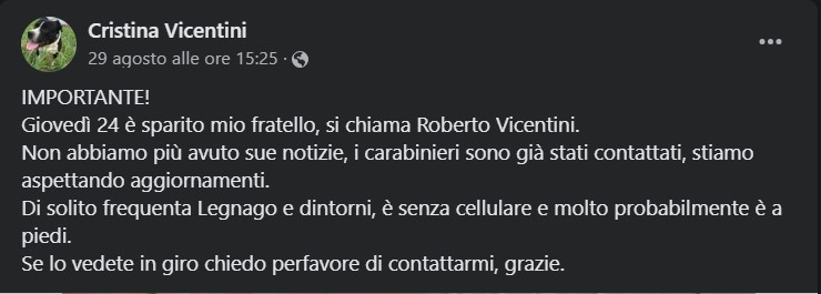 E’ stata la sorella, Cristina, a postare su Facebook un appello che ha subito fatto il giro dei social: “I carabinieri sono già stati contattati, stiamo aspettando aggiornamenti. Di solito frequenta Legnago e dintorni, è senza cellulare e molto probabilmente è a piedi. Se lo vedete in giro chiedo per favore di contattarmi, grazie”. Questo il messaggio condiviso su Facebook dalla sorella.