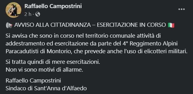 Ed è proprio Raffaello Campostrini, sindaco di Sant’Anna d’Alfaedo, a mettere le cose in chiaro, e a tranquillizzare tutti. “Si tratta di un’esercitazione del 4° Reggimento Alpini paracadutisti di Montorio, che prevede l’uso di elicotteri militari”. Mistero risolto.
