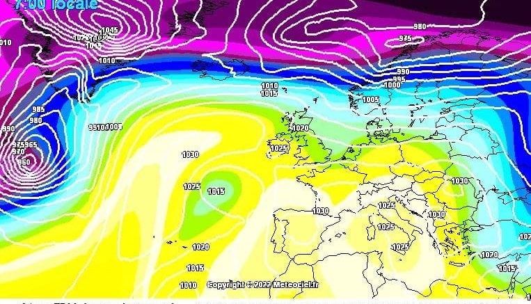 Nell’immagine la pressione in quota ed al suolo prevista per domenica mattina (GFS by meteociel.fr)