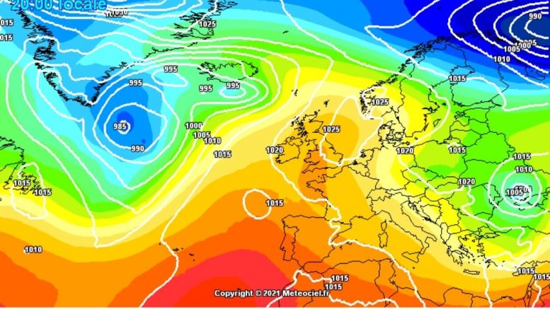 Nell’immagine la pressione in quota ed al suolo prevista per domenica mattina (GFS by meteociel.fr)