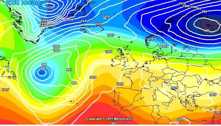 Nell’immagine la pressione in quota e al suolo prevista per domenica mattina (GFS by meteociel.fr)