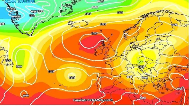 Nell’immagine la pressione in quota ed al suolo prevista per domenica mattina (GFS by meteociel.fr)