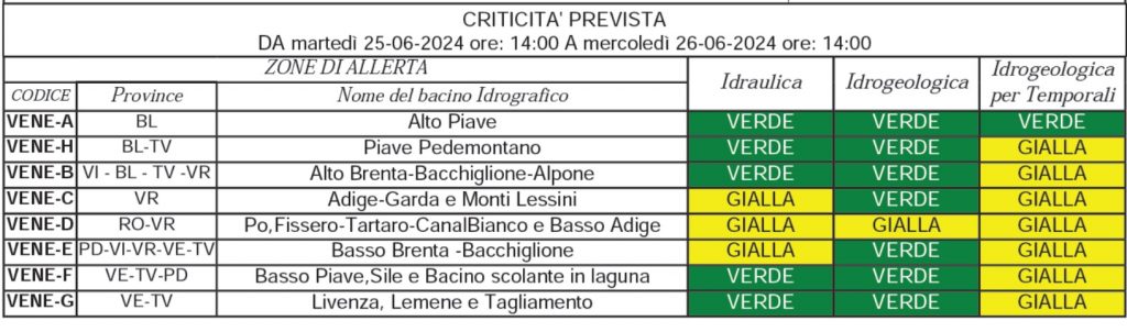 Attenzione (allerta gialla) per criticità idrogeologica per temporali su tutti i bacini nel Veneto ad accezione dell’Alto Piave (Vene-A), valido fino alle ore 3 di mercoledì 26 giugno. Lo scenario sarà caratterizzato da fenomeni intensi e in rapida evoluzione, con possibile innesco di frane superficiali e colate rapide sui settori montani, pedemontani e collinari delle zone in allerta; possibile innalzamento dei livelli della rete idrografica secondaria; rigurgito dei sistemi di smaltimento delle acque piovane con possibili allagamenti di locali interrati e/ o sottopassi.
