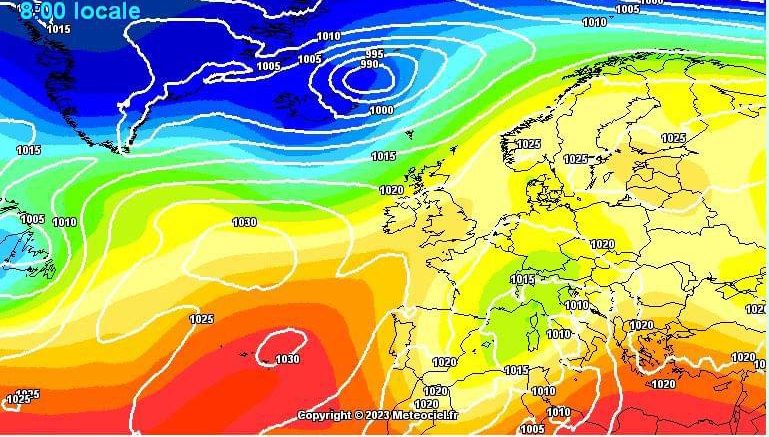 Nell’immagine la pressione in quota e al suolo prevista per domenica mattina (GFS by meteociel.fr)