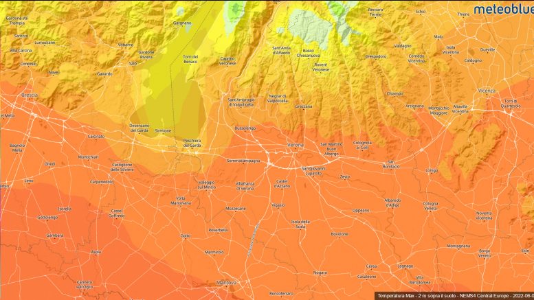 Nell’immagine, le temperature massime previste per il 2 giugno, comprese tra 30 e 32°c sulla pianura veronese. Fonte www.meteoblue.com