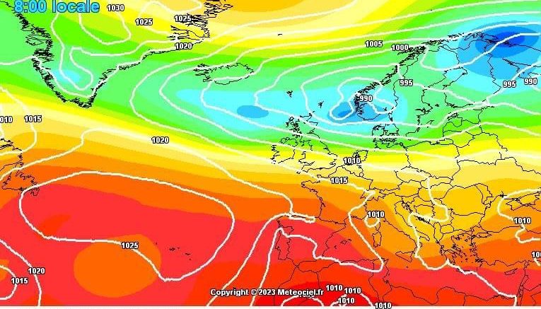 Nell’immagine la pressione in quota e al suolo prevista per domenica mattina (GFS by meteociel.fr)