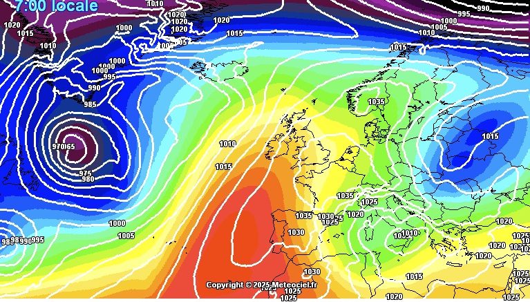 Nell’immagine la pressione in quota ed al suolo prevista per domenica mattina (ICON DWD by meteociel.fr)