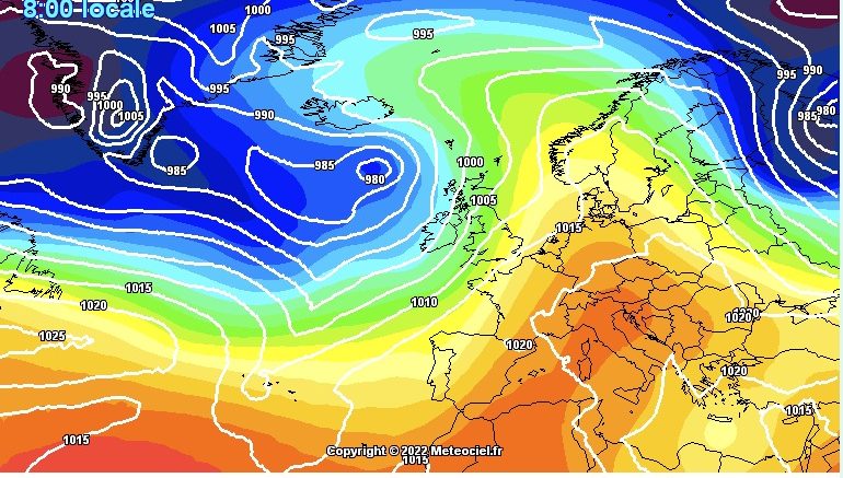 Nell’immagine la pressione in quota e al suolo prevista per domenica mattina (GFS by meteociel.fr)