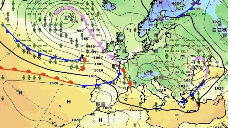 Nell’immagine la pressione e temperatura in superficie e i fronti sul continente europeo previsti per domenica. (ICON by DWD Deutscher Wetterdienst)
