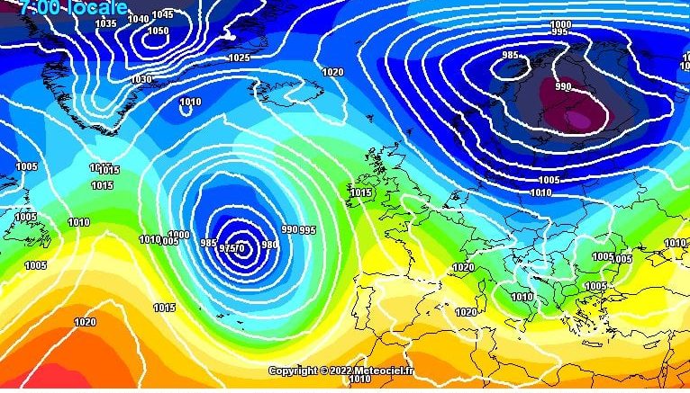 Nell’immagine la pressione in quota ed al suolo prevista per domenica mattina (GFS by meteociel.fr)