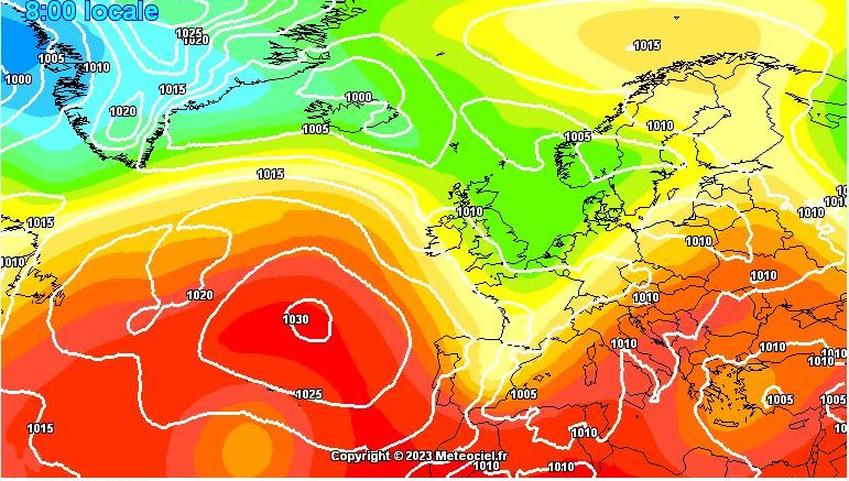 Nell’immagine la pressione in quota e al suolo prevista per domenica mattina (GFS by meteociel.fr)
