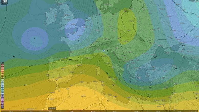 Nell’immagine la pressione in quota e al suolo per sabato pomeriggio, fonte meteoblue.com