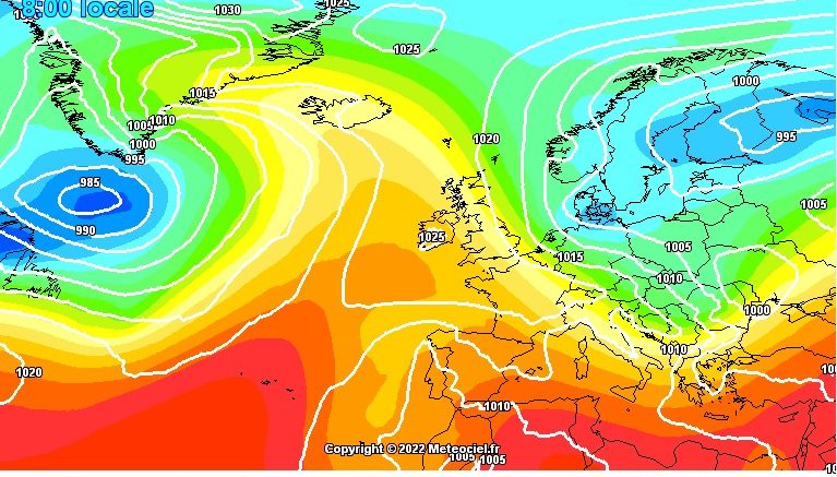 Nell’immagine la pressione in quota ed al suolo prevista per domenica mattina (GFS by meteociel.fr)
