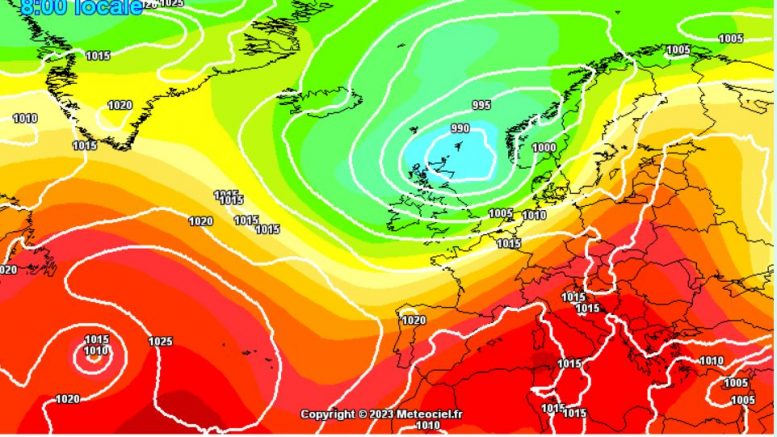 Nell’immagine la pressione in quota e al suolo prevista per domenica mattina (GFS by meteociel.fr)