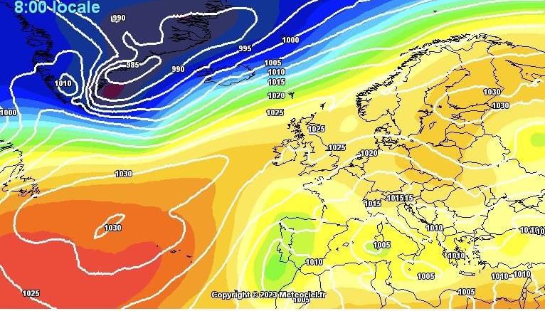 Nell’immagine la pressione in quota e al suolo prevista per domenica mattina (GFS by meteociel.fr)